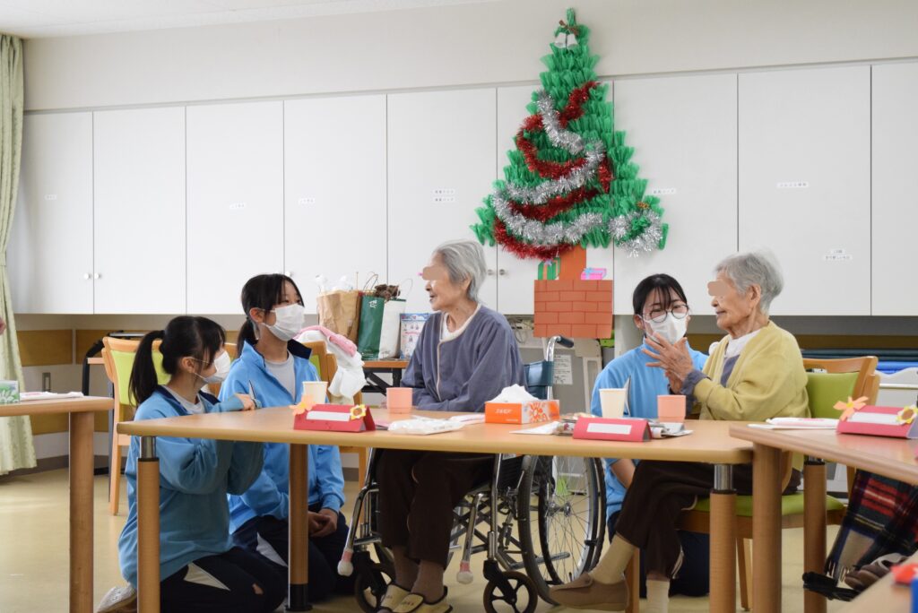 始めは挨拶も緊張した様子でしたが、身体を動かしているうちに徐々に緊張もほぐれ、入所者さんに話しかけたり質問したり会話も弾んでいる様子でした。