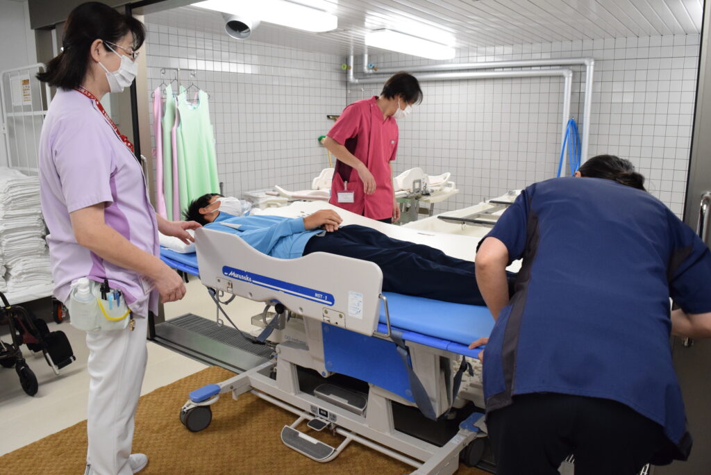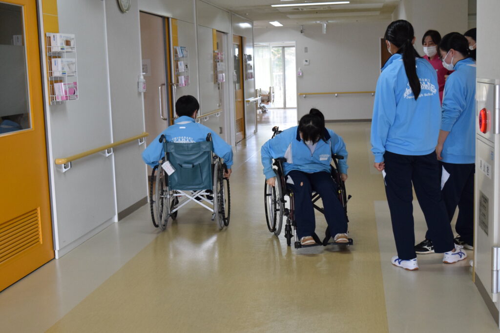 レクリエーションの後は、ストレッチャーや車いすに乗車して、介護される人の気持ちを体験してもらいました。