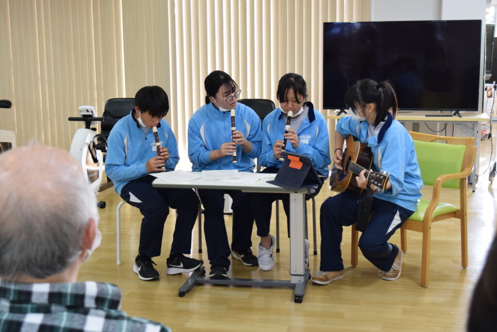 利用者さんと一緒にカラオケを歌って、リコーダーとアコースティックギターで生演奏を披露してくれました。